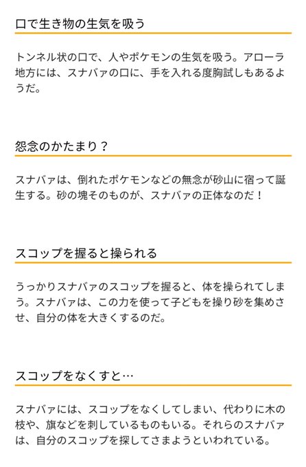 進化後の 『 シロデスナ 』 が 埋めて食べた生き物 の恨みや怨念が 砂に宿ってスナバァになるそうです (怖ぇ ちなみに 頭に刺さっている スコップを子供が握ると操られてしまい スナバァの体を大きくするために 砂を強制的に集めさせられるらしい スナバァ 進化ポケモンずかんの説明文 サン ひとを あやつり すなのやまを すなのしろまで しんか させた。 のろいの ちからも あがっている。 (漢字) 人を 操り 砂の山を 砂の城まで 進化ポケモン カードゲーム 情報などをお届けする公式サイト スナバァ 033 / 060 No769 すなやまポケモン 高さ:05 m 重さ:70 kg 進化 シロデスナ